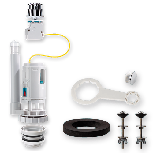 • conjunto completo: incluye pulsador cromado con anillo de montaje superficie-empotrado, mecanismo accionado por cable, tornillos fijación y junta cisterna, embellecedor tapa-agujero lateral cisterna y llave de apriete.